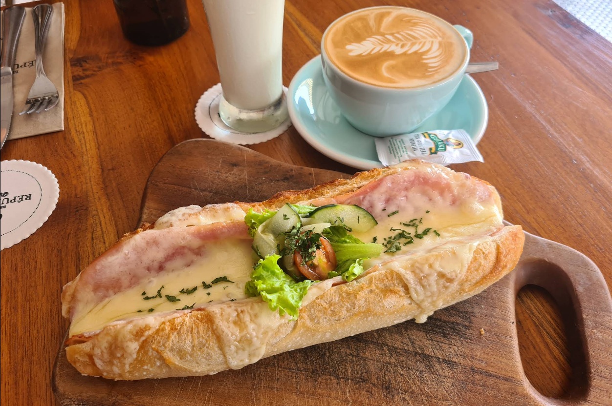 Fresh long baguette filled with ham and melted cheese, paired with a smooth flat white coffee and creamy banana milkshake – a delicious French-inspired meal at Brasserie Republic in Sanur, Bali.